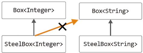그림으로 보면 직관적으로 알 수 있듯이, SteelBox는 Box를 상속받고, Integer를 파라미터로 갖는 SteelBox 제네릭 클래스는 당연 Integer를 파라미터로 갖는 Box 제네릭 클래스를 상속받을 수 있다. 그러나 String을 파라미터로 갖는 Box 제네릭 타입은 상속받을 수 없다. 왜냐하면 Box<String> 파라미터화 타입은 하나의 독립된 타입이고, SteelBox<Integer> 파리미터화 타입 또한 하나의 독립된 타입이기 때문이다. 그림으로 봤을 때는 쉽게 이해할 수 있지만 기억하지 않으면 쉽게 헷갈릴 수 있는 내용이다.