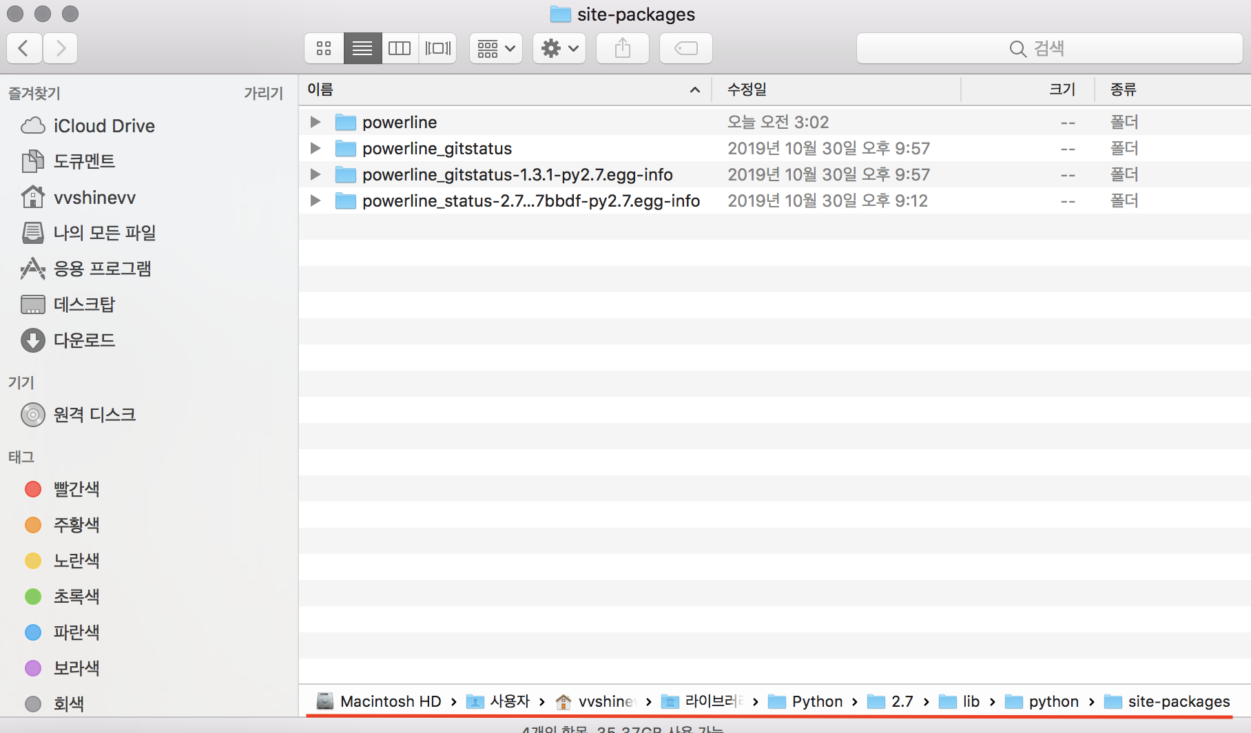 참고로 /Users/vvshinevv/Library/Python/2.7/lib/python/site-packages/ 위치는 위에 "pip show powerline-status"로 확인한 경로 부분에서 가져온 것입니다. 착오없길 바랍니다.