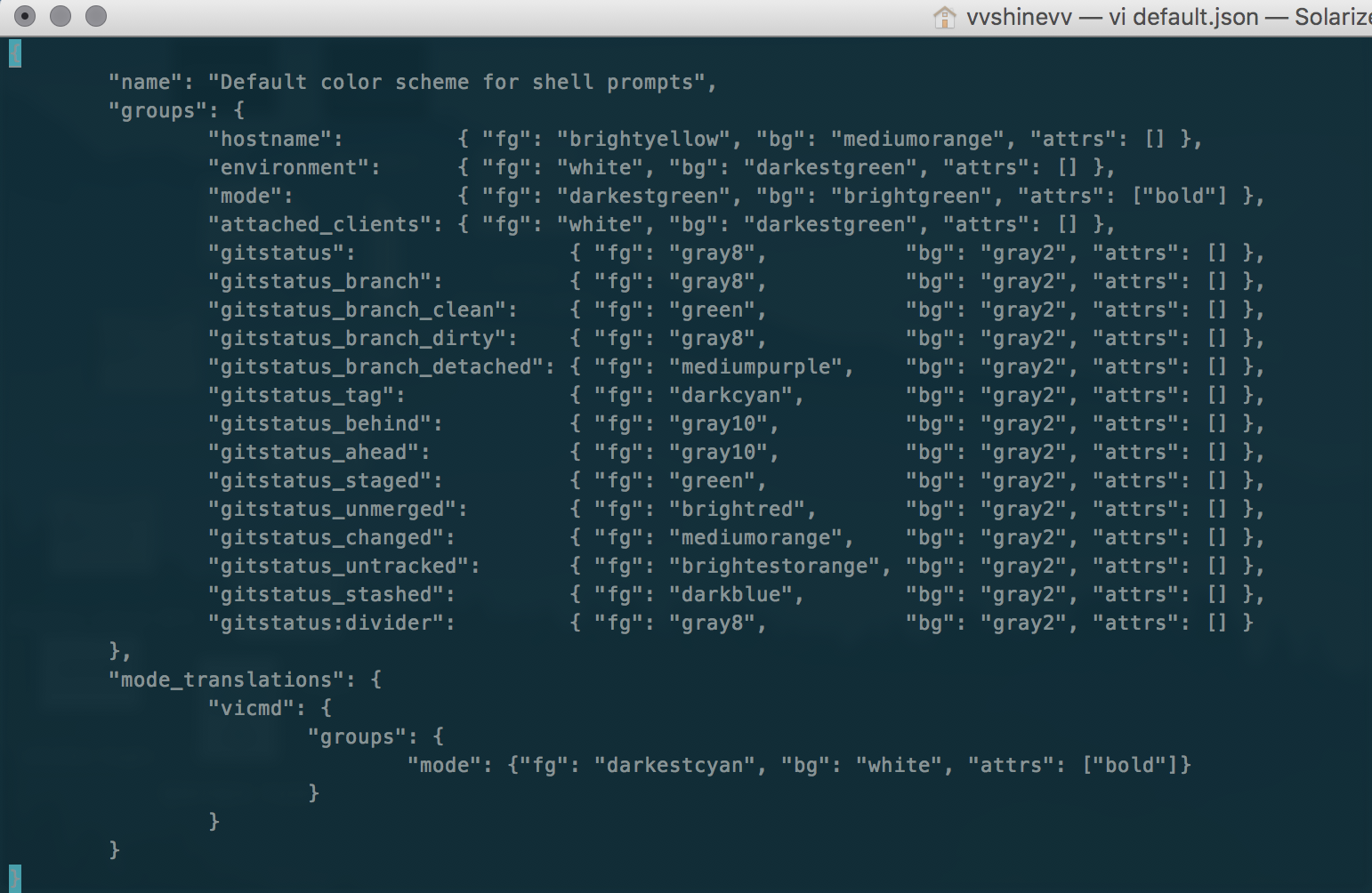 예시 : /Users/vvshinevv/Library/Python/2.7/lib/python/site-packages/powerline/config_files/colorschemes/shell/default.json