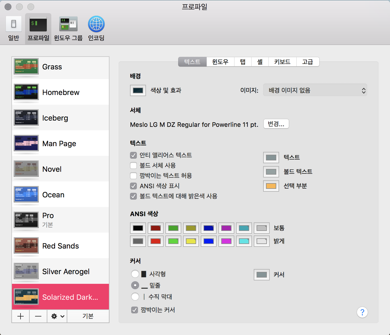 7. 터미널 > 환경설정(Preference) > 프로파일 > "Solarized Dark..." 기본으로 설정